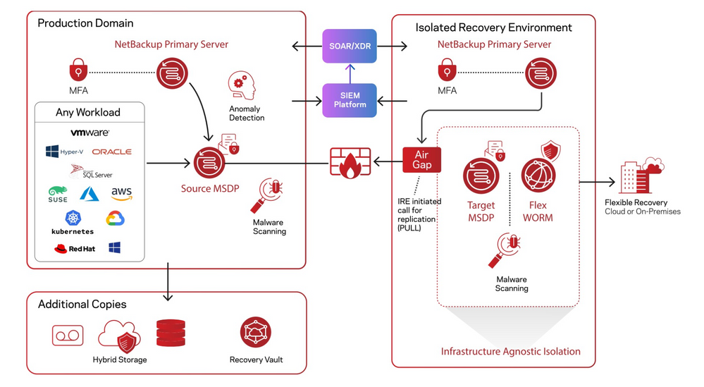 使用者可以在 NetBackup BYO 介質伺服器或 Flex Appliance WORM Storage 伺服器上配置 IRE ,在生產環境和受保護資料的副本之間創建氣隙。氣隙限制了網路對資料的訪問,排除可能發生在資料複製活動時間段之外的潛在干擾因素,進一步增強針對勒索攻擊和惡意軟體威脅的保護。