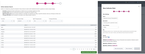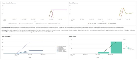 Entity Behavior Scores 儀表板中包含觸發每個規則的數量和評分歸因的資訊,可指導您應該如何調整規則。與此同時,Review Indicators (檢視指標) 和 Review Scoring Rules (檢視評分規則) 儀表板則提供了隨著時間進行,從您部署的搜尋所回傳的事件數量和搜尋效能的相關資訊。