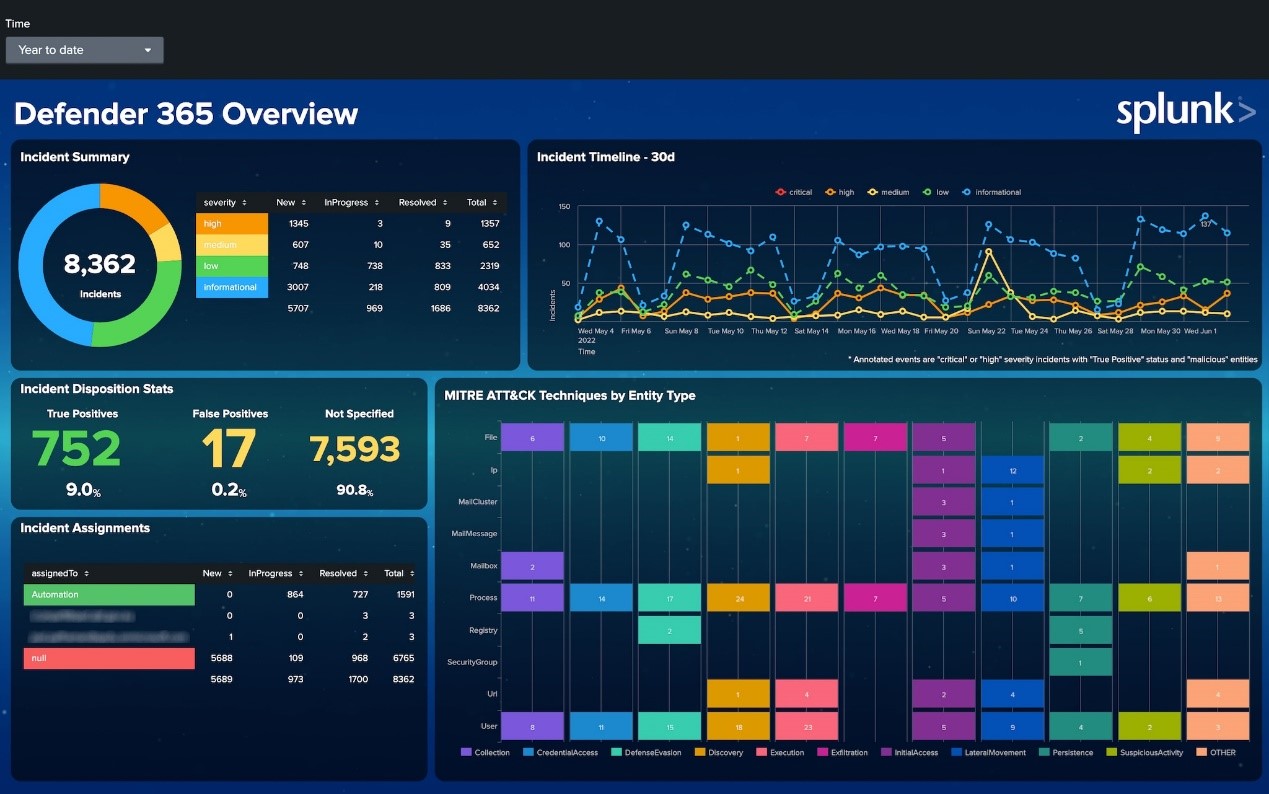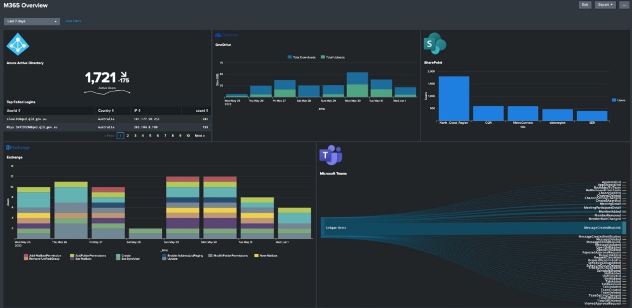 儀表板 (Dashboard) 是可以一次傳達大量資訊的強大工具。許多 Splunk 應用程式都搭載了儀表板,以幫助您充分利用您的資料。例如,Microsoft 365 App for Splunk 中包含了許多儀表板,可提供使用情況、事件等深入資訊。