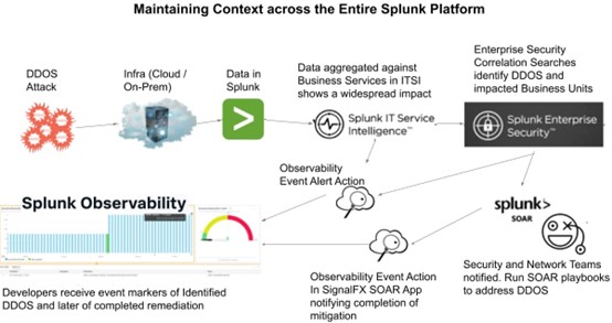 圖 2-2:透過 Splunk ITSI、Enterprise Security、Splunk SOAR 將 DDOS 攻擊及其補救措施傳遞到 Splunk Observability 中