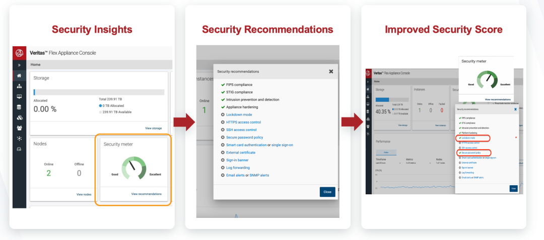 Flex 一體機的多層零信任架構涵蓋基礎架構安全和資料安全。Veritas 解決方案通過不可變存儲和加密確保資料彈性,通過惡意軟體掃描、異常檢測以及檔分析和分類等方法,包括隔離惡意軟體和大規模恢復來確保資料狀態清晰可見。