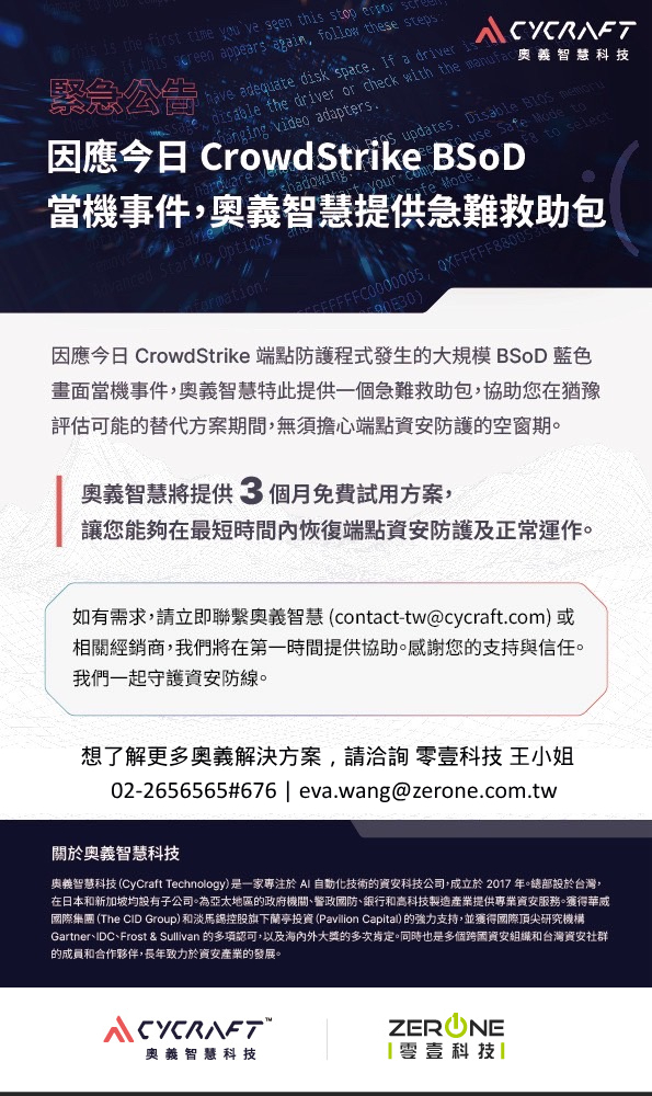 因應CrowdStrike BSoD當機事件,奧義智慧提供急難救助包