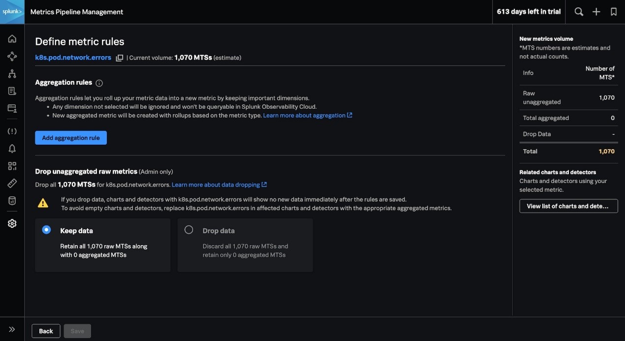 透過最新的 Metrics Pipeline Management 使用者介面,使用者可以在擷取度量之前進行彙總或加以丟棄,只保留需要的度量,捨棄不重要、基數高的度量,以減少他們收集的度量數量。在經過彙總或過濾後,您只需要支付儲存剩餘資料所需的費用,進而降低總擁有成本。您可以透過管線 (一系列的資料處理步驟或流程) 規則管理彙總和資料篩選,並根據業務需求進行套用和調整。
