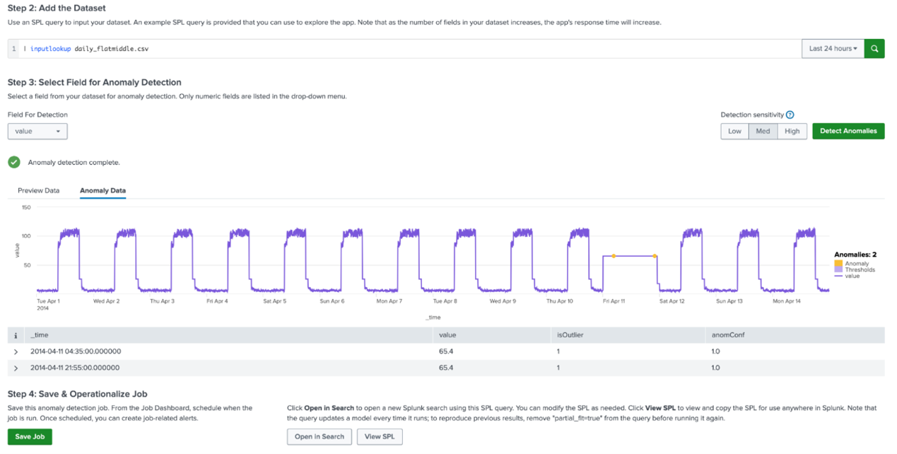 除了使異常偵測更容易外,Splunk App for Anomaly Detection 還具備了一系列功能,以便更容易地實現異常偵測。您可以透過點擊按鈕調整結果的靈敏度。當您對結果滿意後,可以建立一個新的異常偵測作業,並在作業儀表板 (Job Dashboard) 中進行管理。如果您想在 Splunk 內部建立一個 SPL 查詢並在其他地方操作它,該應用套件也提供了一種簡單的方法來實現這一點!