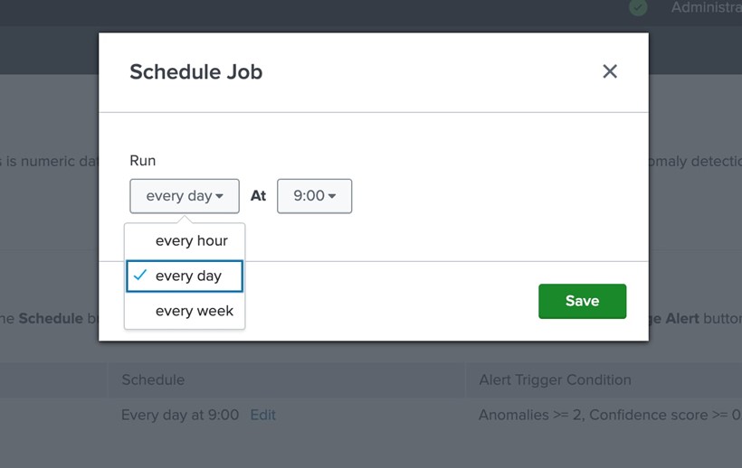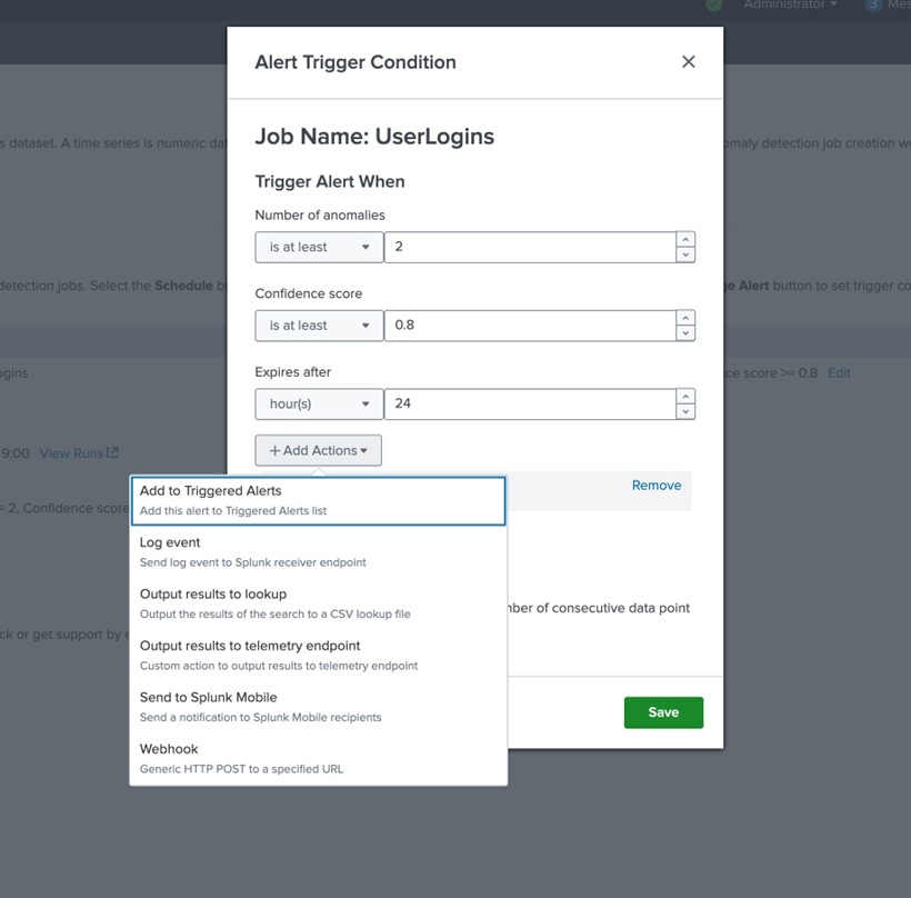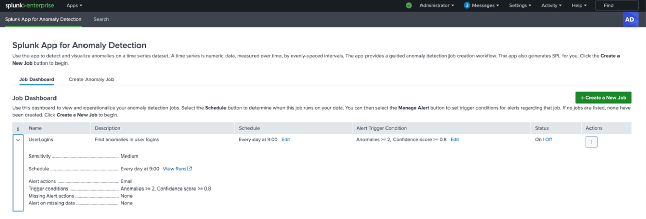 您可以從作業儀表板根據需要排程作業,以固定的間隔執行偵測,還可以根據發現的異常情形數量和其信心評分來架設警示。您可以選擇當警示觸發時要執行的操作,例如將其新增到已觸發的警示或記錄事件,也可以選擇在遺失資料時收到警示。該應用套件可以讓您設定連續遺失的資料點數量,以觸發相關警示。