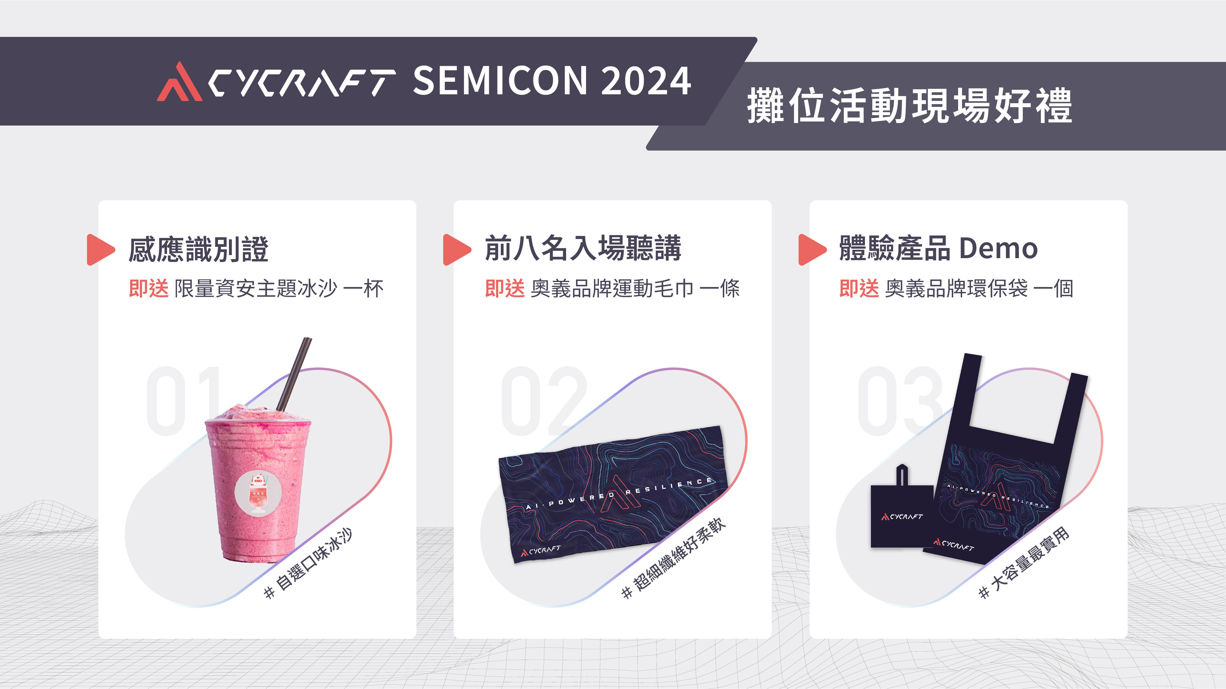 炎炎夏日,逛展是否又渴又累呢?奧義智慧在 SEMICON Taiwan 2024 首度推出【奧義冰菓室 Crafty Smoothie】活動,只要來攤位和我們互動並感應識別證,即可獲得每日限量的資安主題冰沙一杯。除此之外,聆聽攤位短講或是體驗產品 Demo 展台,也可以獲得精美的奧義品牌禮物!
