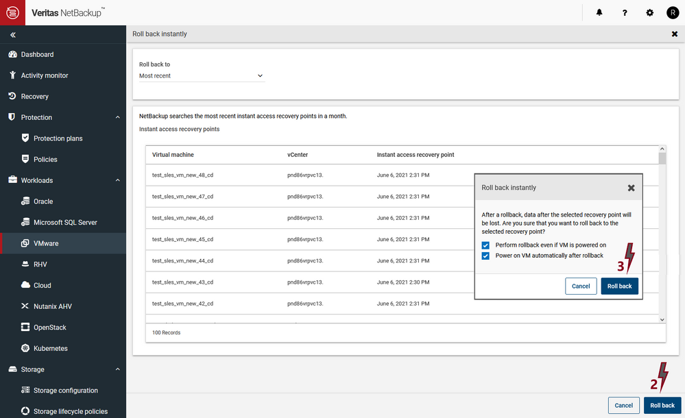 接下來,用戶可以通過幾次點擊確定希望回滾到的復原點,最後的確認更改將回滾到生產 VM。同時,用戶也可以通過使用 NetBackup API 的自訂資料保護工作流實現大規模虛擬機器恢復。