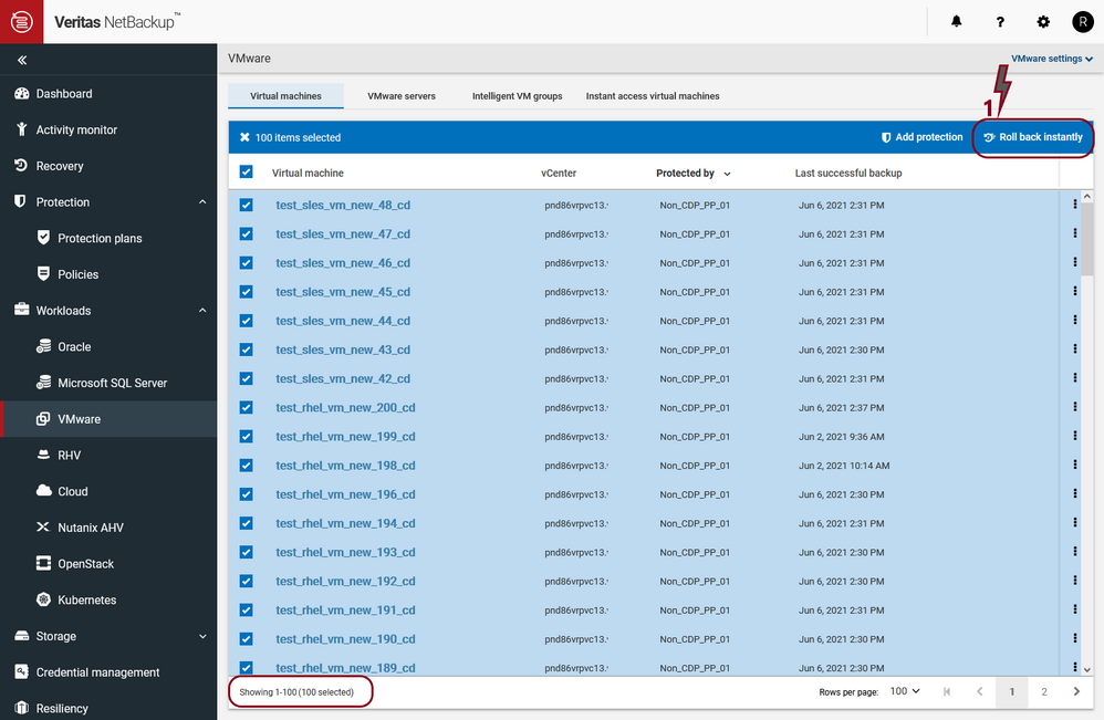 VMware 管理員可以利用 NetBackup 的自助服務能力來協調這些操作:在使用者介面每次提交回滾時,只需勾選想要恢復的虛擬機器,然後點擊“立即回滾”。或者批量勾選多達100台虛擬機器,一鍵“立即回滾”。