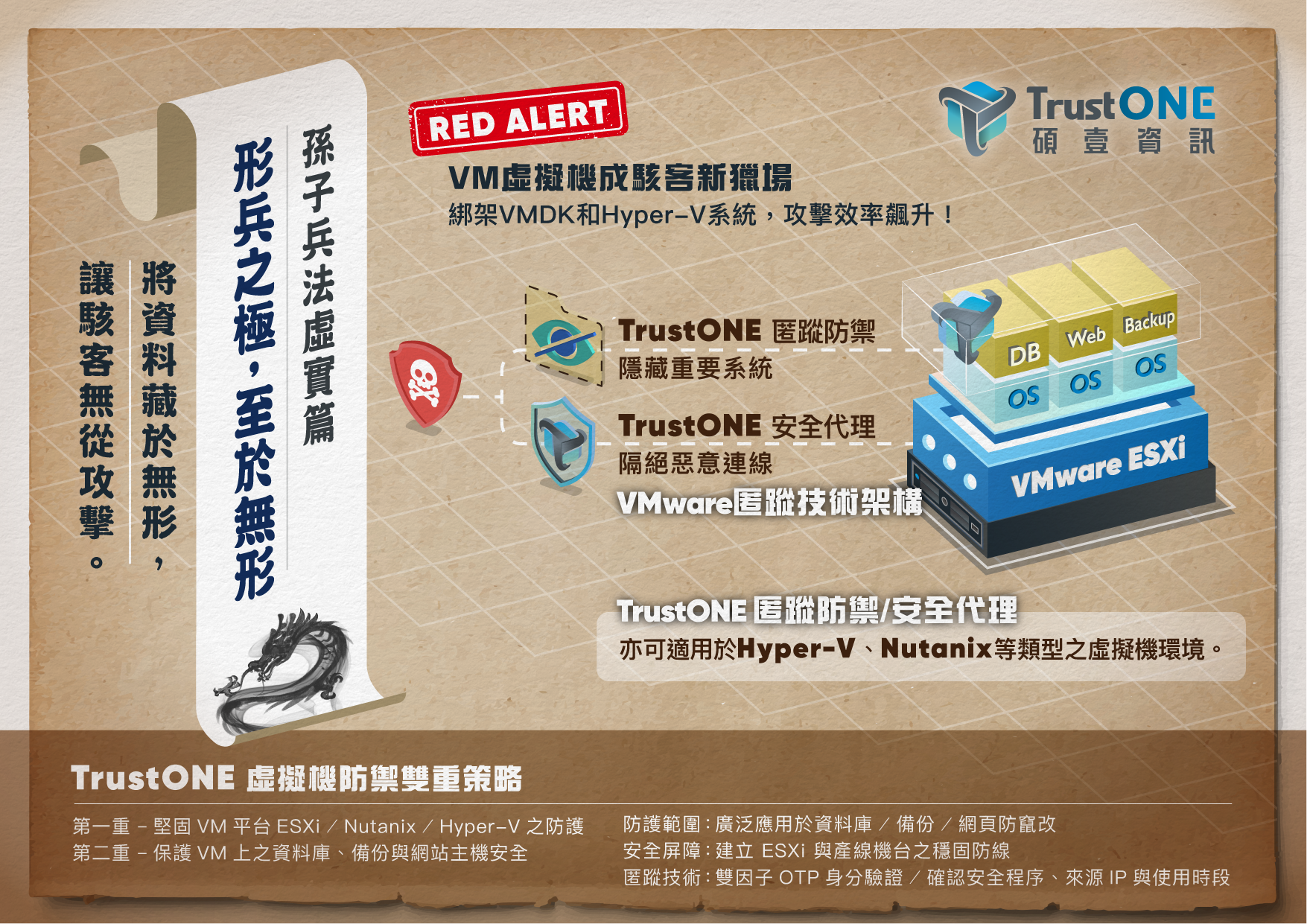 客戶所採購的眾多資安產品中,包括防火牆、防毒及EDR,這些資安產品大多採用特徵碼比對及行為模式分析技術,但面對詭譎多變的入侵手法與挑戰,TrustONE回歸初衷,借鏡孫子兵法虛實篇─「故形兵之極,至於無形;無形,則深間不能窺,智者不能謀。」意思是指善於防守者,使敵人不知道從哪進攻,不知怎樣進攻。見不到一點形跡,不漏出一點消息。