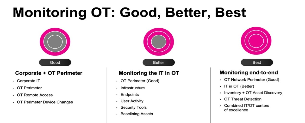 Splunk 的安全領域解決方案團隊以 OT 安全的成熟模型為指導,程度包括監控邊界 (好)、監控 IT 和 OT 軟體系統 (更好),最終是實體程序和控制層 (最好),以保護所有 OT 環境。自上次版本發布以來,我們解決方案的邊界監控功能廣受客戶肯定,並希望進一步幫助他們在安全之旅上繼續成長。客戶告訴我們,他們不僅想監控邊界,並希望擁有更多在 OT 環境中可以立即監控 IT 的技術,並且想將 OT 安全資料整合到單一地點,以同時檢視不同的技術。