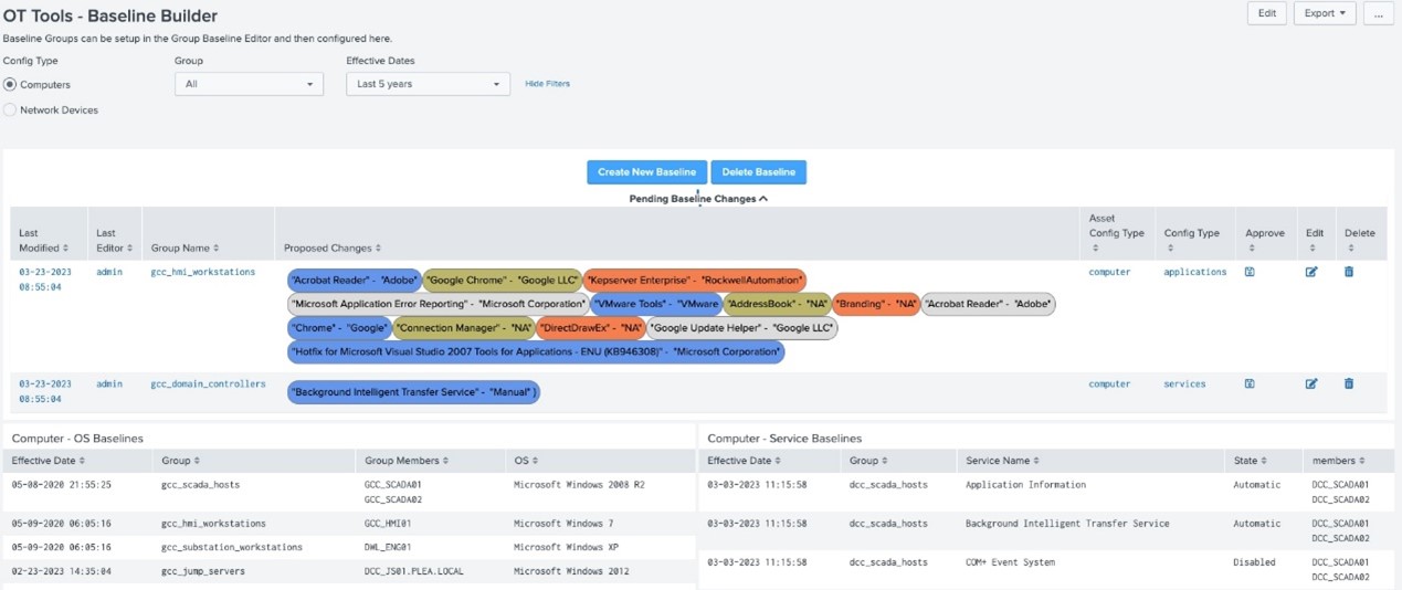 在早期版本的 OT Add-On 中,Splunk 釋出了一些對電腦和網路資產設定基線的功能 (基本上是根據 NERC CIP 要求)。雖然它們有助於識別偏差情形,但建立這些基線的過程並不容易,而且大部分需要手動。製作基線是用於強化 OT 環境的常見做法,在這些環境中,有時安全團隊無法部署特定的安全保護措施。因此,由於這些環境是更加靜態的,部分客戶會試圖透過確保在端點上設定了同樣的軟體、服務、連接埠和其他配置來強化端點。