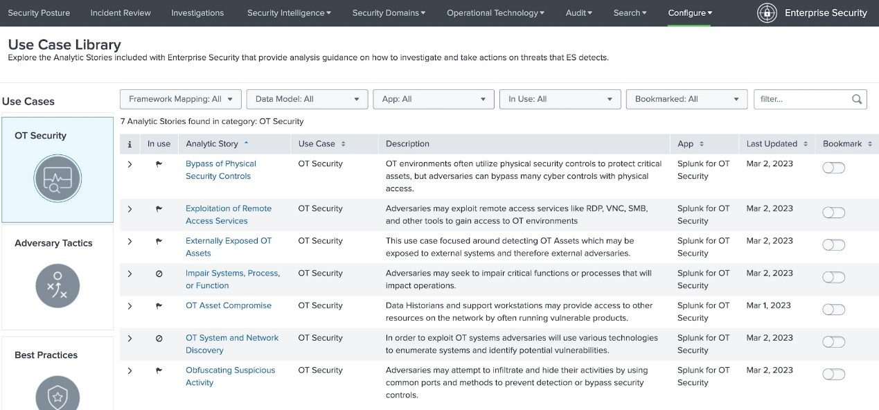 Splunk 的 Enterprise Security (ES) 提供了大量的功能,我們的團隊致力於確保 OT 附加元件都能善用這些功能。包括從 ES 的設定頁面直接設定巨集、增加儀表板之間的連結,並且利用現有的 ES 安全架構等。ES 的使用案例庫有助於客戶更佳了解如何應用 OT 附加元件,以及現有的 ES 和 ES Content Updates (ESCU) 偵測。OT Add-On 現在提供到安全架構和現有相關規則的對應,您可以在 OT Security 的新使用案例類別中找到它們。