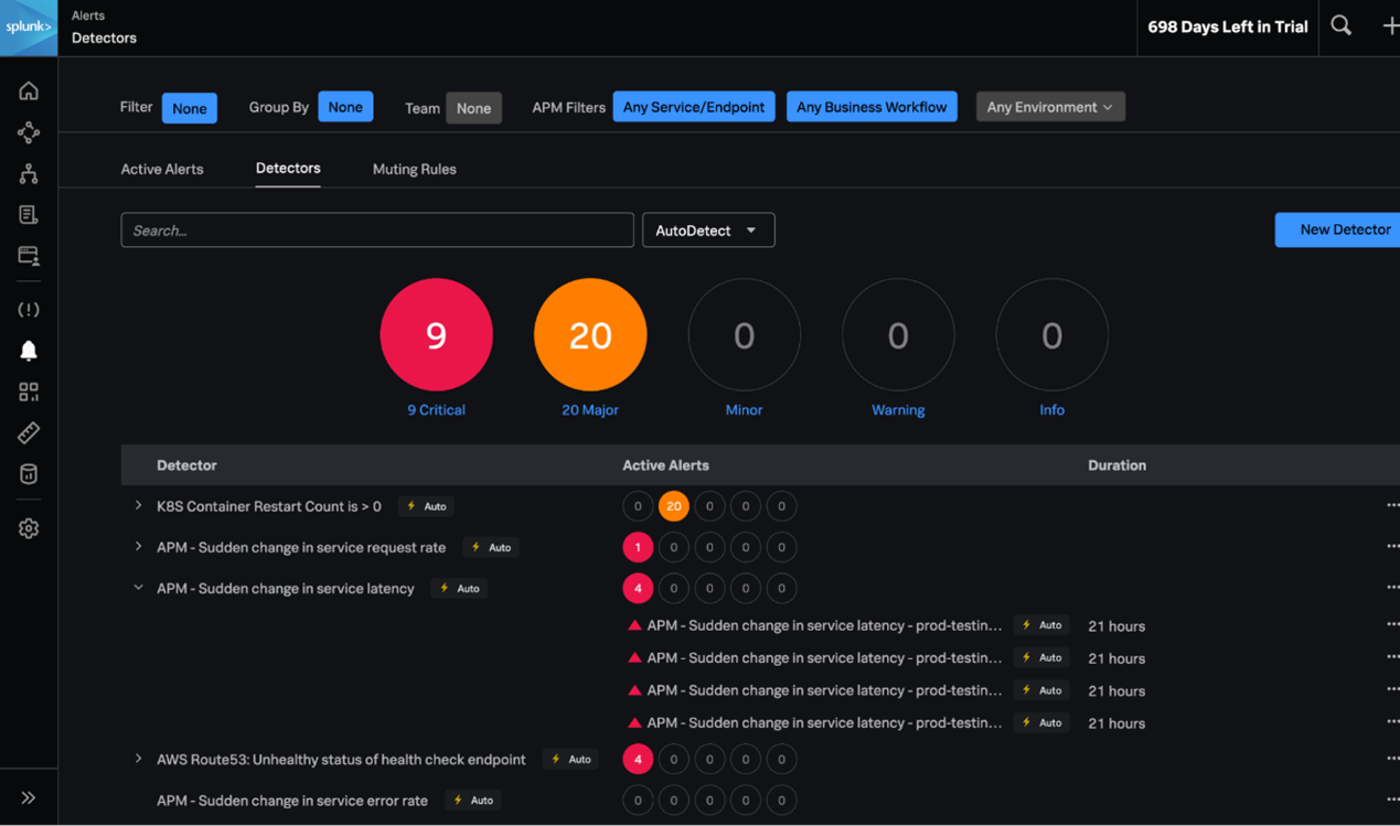 Splunk Application Performance Monitoring (APM) AutoDetect:APM AutoDetect 使用機器學習 (ML) 來顯著提高準確性,並減少設定服務警示所需的手動工作。AutoDetect 提供了一種更簡單的方式,可為每個服務建立效能基線,為突然變化的延遲、錯誤和請求速率建立自動檢測器,並可自訂和訂閱這些檢測器的警示通知。 因此,您只需花費更少時間重新設定警示,就可以在雲端原生環境中獲得最準確的警報。