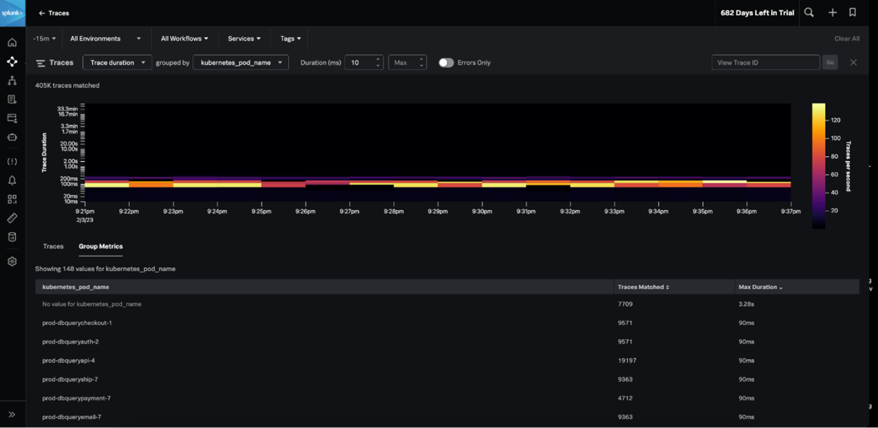 Splunk Application Performance Monitoring (APM) Trace Analyzer:可自信地偵測數十億筆交易中的模式,並在任何標籤、使用者或服務中找到特定問題。Splunk APM Trace Analyzer 可以幫助您識別導致問題的未知問題,涵蓋無限種組合的標籤和中繼資料,為特定使用者解決問題,並了解問題如何影響客戶群體。