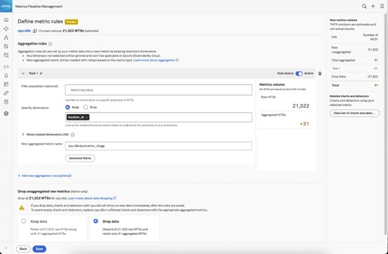 Splunk Infrastructure Monitoring Metrics Pipeline Management:Splunk Infrastructure Monitoring 的 Metrics Pipeline Management 讓您能夠擴大監控規模,使您可以快速進行故障排除,同時不會顯著增加監控的成本。藉由動態定義政策規則,可輕鬆控制和匯總大量度量數據,過濾不需要的數據,只需要擷取、儲存和分析您需要的資料即可。
