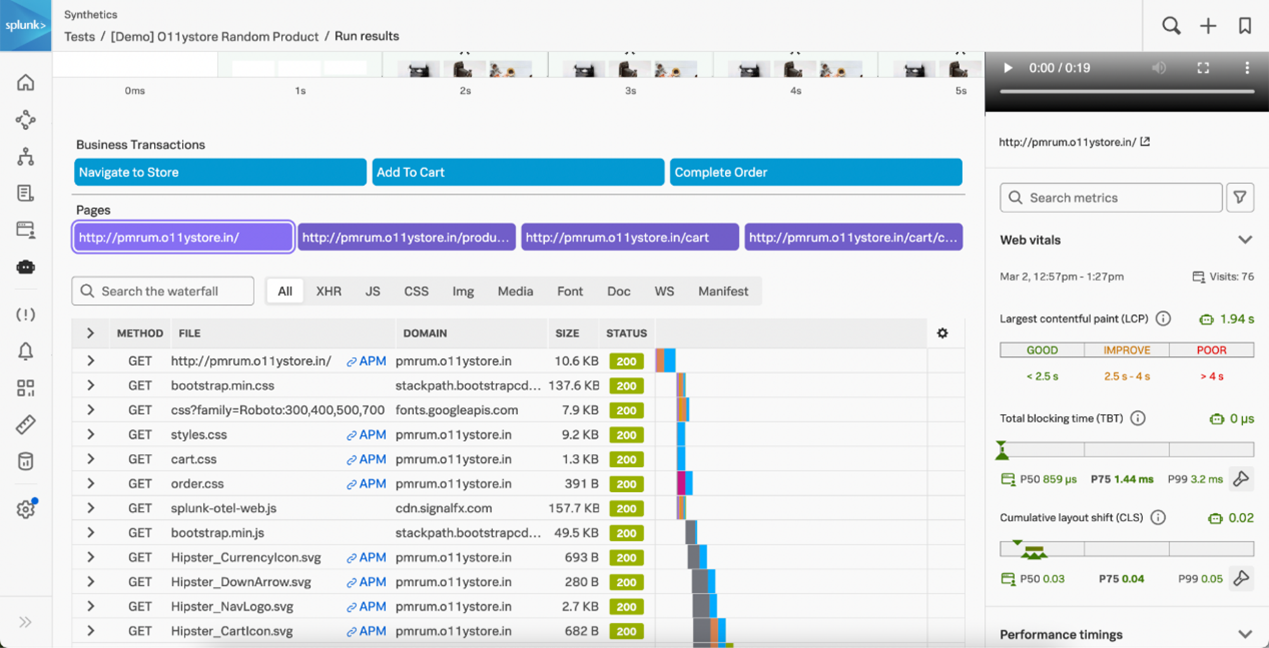 Splunk Observability Cloud 中的 Integrated Digital Experience Monitoring (DEM):在單一畫面上,將瀏覽器的真實使用者監控 (RUM) 度量與綜合測試的頁面級效能度量的相關性視覺化。透過整合視覺化 RUM 度量與綜合度量,您可以快速判斷問題是系統性還是區域性的,是測試異常還是實際應想了使用者,以便優先處理和加快問題解決,提供正常的數位化操作。