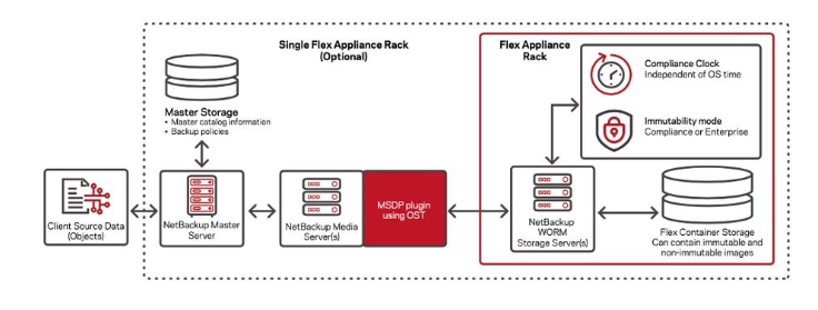 NetBackup 8.3主服務器與儲存單元通信,集成了防篡改和刪除能力,並可設置WORM保留期限(最小/最大)。然後,主服務器在儲存單元上設置防篡改控制,並應用WORM保留期限策略。NetBackup軟體可提供帶有防篡改鎖可視性展現的備份映像(Backup Image)管理功能,WORM保留期滿後的映像刪除(通過CLI),並尊重對目錄的合法持有。Flex一體機運行防篡改儲存服務器來提供WORM功能、保留鎖以及針對勒索軟體和惡意軟體威脅的平台加強防護。合規時鐘(Compliance Clock)用於保留期限,並且是獨立於操作系統時間的。Flex一體機有兩種鎖定防篡改模式——企業模式和合規模式。設備鎖定狀態可以在任何時候啟用。用戶可以選擇合規模式或企業模式的MSDP儲存容器,但不能混合使用。