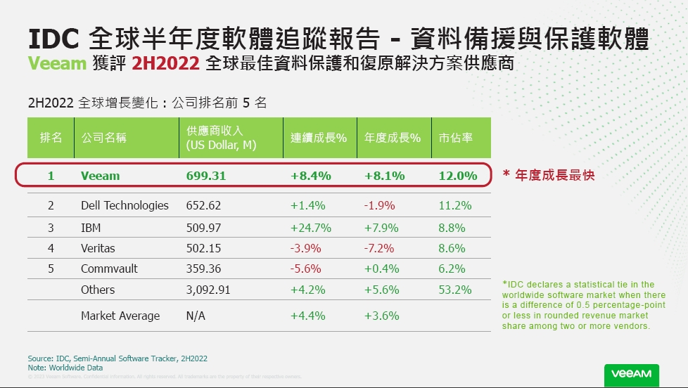 提供現代資料保護和復原解決方案的領導者Veeam® Software今天宣佈在國際數據資訊有限公司(International Data Corporation,IDC)發佈的半年度軟體市場追蹤報告中喜獲佳績,成為2022年下半年全球資料備份及備援軟體市場中排名第一的供應商。該追蹤報告顯示,Veeam的年度同比增長率(未按固定匯率調整)為8.1%,明顯高於其它四大供應商和整個市場的平均增長率。同時,根據追蹤報告的資料,Veeam的收入在2022年上半年連續增長8.4%。