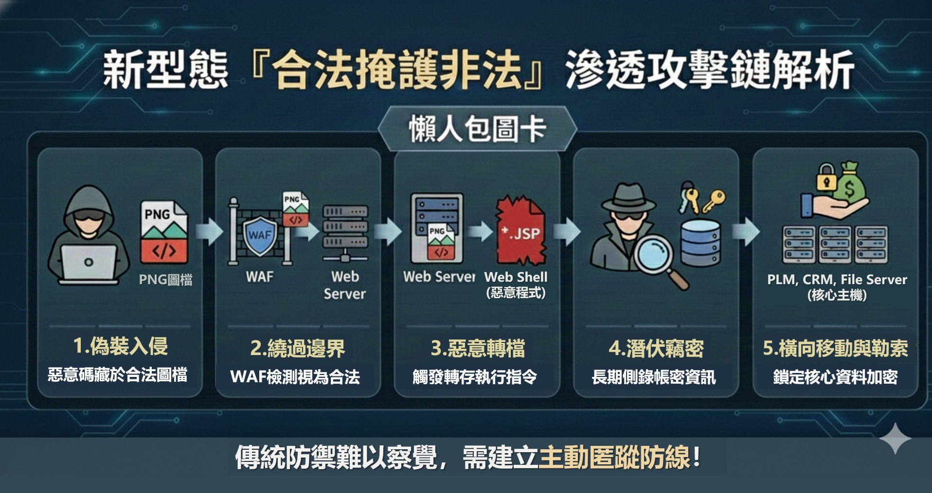 近期駭客攻擊手法再進化,傳統防禦邊界正面臨嚴峻挑戰。現在的攻擊多採用「合法掩護非法」的高明技巧:駭客將惡意程式碼偽裝成看似無害的 PNG 圖檔,成功繞過 WAF(網站應用程式防火牆)檢測。一旦 Web Server 載入該檔案,便會執行並轉檔生成 *.jsp 惡意腳本。