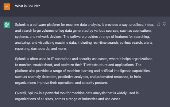 除了 DALL-E,2022 年最引人注目的事情之一就是 OpenAI 如何真正向人們展示機器學習的可能性。DALL-E 和 ChatGPT 都展示了一些令人難以置信的創新。尤其,和 ChatGPT 有關的話題真的很有趣。有沒有人發現他們的 LinkedIn 資料被 ChatGPT 拿去用了?看看它如何為 Splunk 寫出近乎完美的電梯簡報。