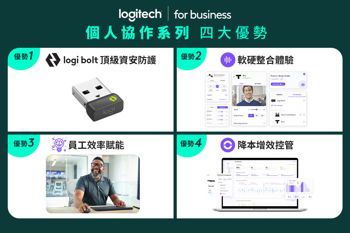 Logitech for Business 個人協作系列具備四大優勢:頂級資安防護、軟硬整合體驗、員工效率賦能、降本增效控管,提供企業和員工全方位的協作支持