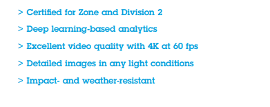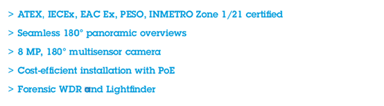 新款ExCam XF P3807經過防爆認證的全景800萬像素四鏡頭攝影機,不僅提供 180° 全景全區影像,也能夠完美拼接所有四張影像,可讓使用者監視單一平順、連貫的影像串流,而非觀看多個影像串流。 並通過ATEX、IECEx、EAC Ex、PESO、INMETRO Zone 1/21 認證