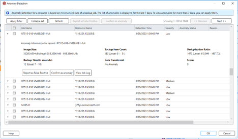 異常檢測功能監視每個作業配置的模式。需要運行30次作業才能啟動異常檢測引擎並檢測作業中繼資料中的異常。如果任何參數不符合通常的模式並且脫離集群,則引擎將報告為異常。異常分數是根據其與正常範圍的偏差來計算的,系統根據分數計算異常的嚴重程度。如果任何備份報告異常,則會發出警報。