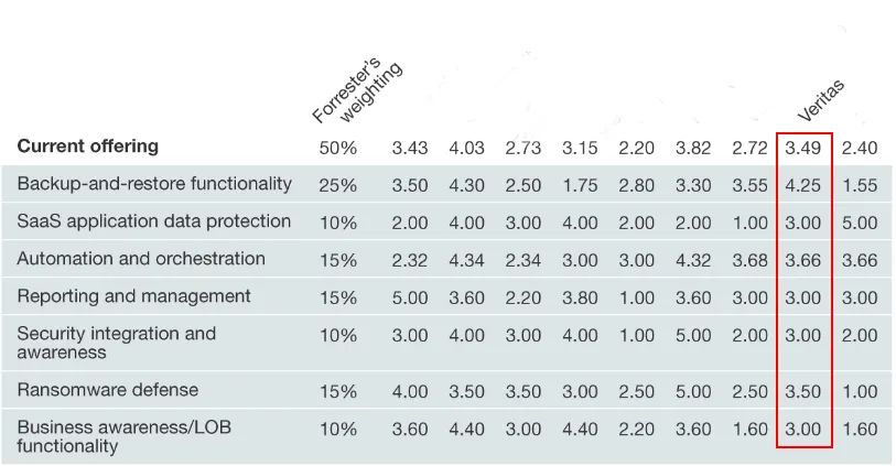 在九大接受評估的市場主流供應商中,Veritas 是唯二在各細分項評估中得分均超過3分(滿分5分)的供應商之一。(基於 NetBackup 10和 NetBackup SaaS Protection 評估)