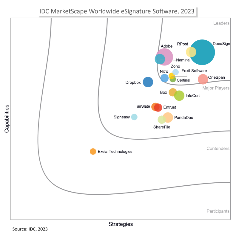 我們很高興地宣布,Docusign 在 2023 年 IDC Marketscape 全球電子簽章軟體供應商評估中被評為領導者。在最新發布的報告中,IDC 根據兩個關鍵標準對 18 家電子簽名供應商進行了評估:策略和能力。