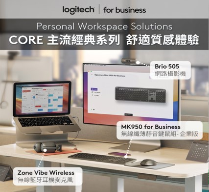 Logitech企業版-CORE主流系列,包含MK950無線纖薄靜音鍵鼠組、輕盈舒適的Zone Vibe Wireless藍牙耳機,和具有高解析度的Brio 505攝影機,提供舒適辦公體驗。