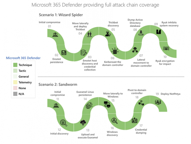 Microsoft 365 Defender 展現了完善的技術層級涵蓋範圍,能一舉因應 Wizard Spider 和 Sandworm 的所有攻擊階段,進而運用人工智慧導向的適應性保護機制。