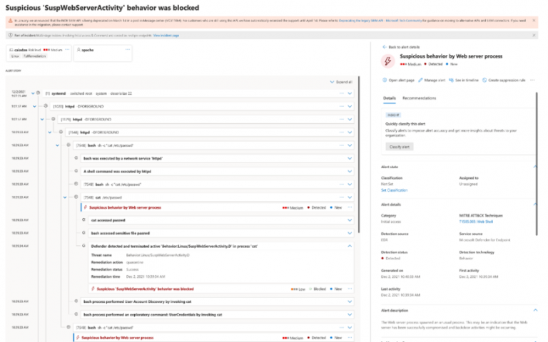 舉例來說,如同下圖 所示,Linux 裝置上適用於端點的 Microsoft Defender 會針對 Web 伺服器程序的可疑行為發出警示。這項警示有助於封鎖敏感檔案讀取功能,並避免進一步讀取檔案。隨後,攻擊者試圖在裝置上下載和執行後門。但此一行為也遭到封鎖,因而成功防堵了後續的入侵作業。