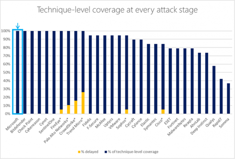 Microsoft 365 Defender XDR 解決方案可成功為安全性作業中心 (SOC) 產生每個模擬攻擊的單一全方位事件,藉此展現領先群倫的涵蓋範圍。每個事件中提供的全方位檢視會詳細列出可疑的裝置和身分識別活動,且備有無與倫比的對抗技巧,能一舉涵蓋整體攻擊鏈。此外,Microsoft 365 Defender 也能及早抵禦攻擊,藉此提供 100% 的保護力。