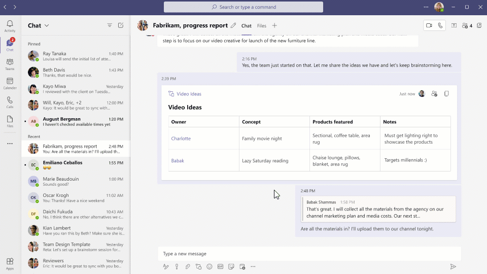 在 Teams 中聊天時,您可以針對特定訊息做出回覆。回覆文字方塊將引用原始訊息,進而讓聊天室中的所有人更輕鬆地掌握訊息的上下文。舉凡一對一、群組和會議聊天,皆可使用引用回覆功能。