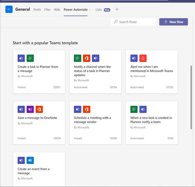 Power Automate 範本已新增至 Teams 範本中