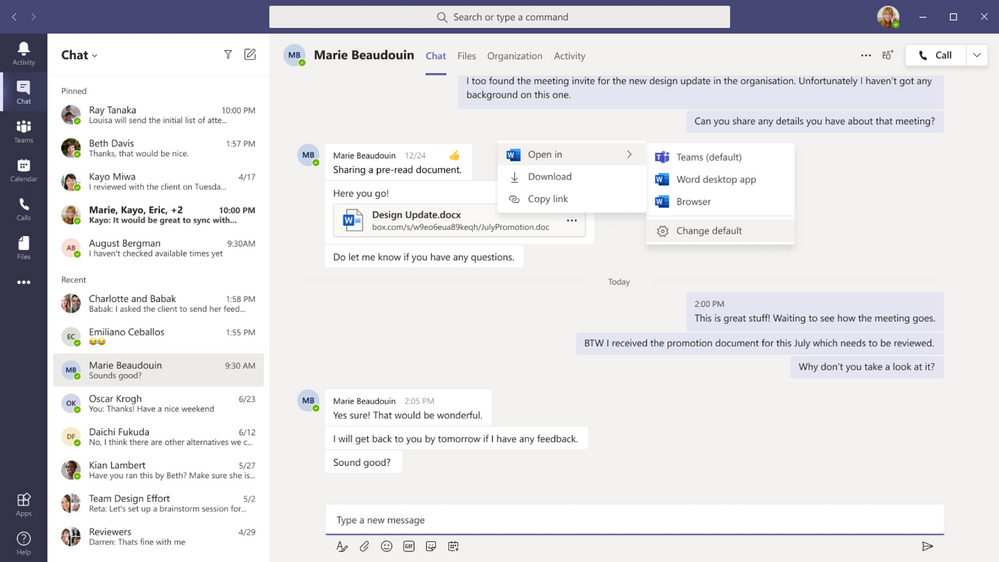 通常,我們會一邊使用 Office 文件 (Word、Excel 和 Power Point),一邊在 Teams 中聊天和協同合作。現在,使用者能進一步控制在 Microsoft Teams 中開啟的 Office 文件。您可以使用新的設定 (在 Teams、瀏覽器或 Office 傳統型應用程式中),透過自身偏好的方式開啟所有 Office 文件。不過,在 Office 傳統型應用程式中開啟文件的選項,僅適用於已安裝並啟用 Office 版本 16 或更新版本的使用者。