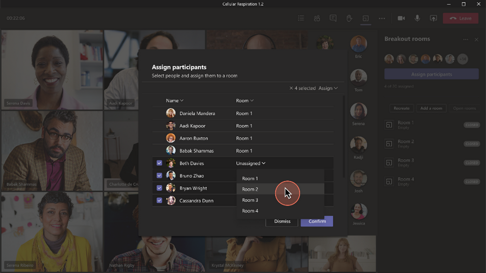 參與者分配的模式窗口中的新分配體驗現在從分組討論會議室的右側面板移動到選擇分配參與者時彈出的單獨窗口。增強的界面允許您按參與者或房間進行排序。您還可以使用參與者姓名旁邊的複選框來選擇多個參與者並將他們分配到房間。這有助於您快速找到您的參與者或房間,加快分配過程。在 GCC 中可用。