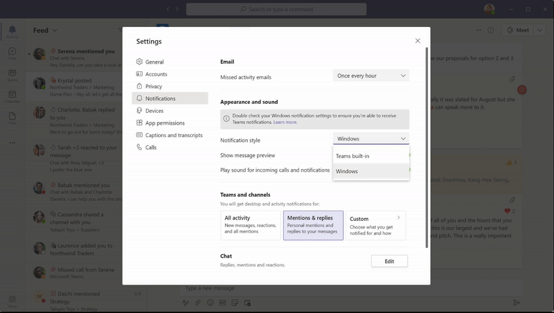 Teams 通知樣式的Teams 通知樣式的新默認值將默認為新用戶的本機通知。當前默認樣式為 Teams 紫色。通過對原生通知的這種更改,用戶將受益於對輔助模式、操作中心、可訪問性等的支持。現在可在 GCC 中使用。