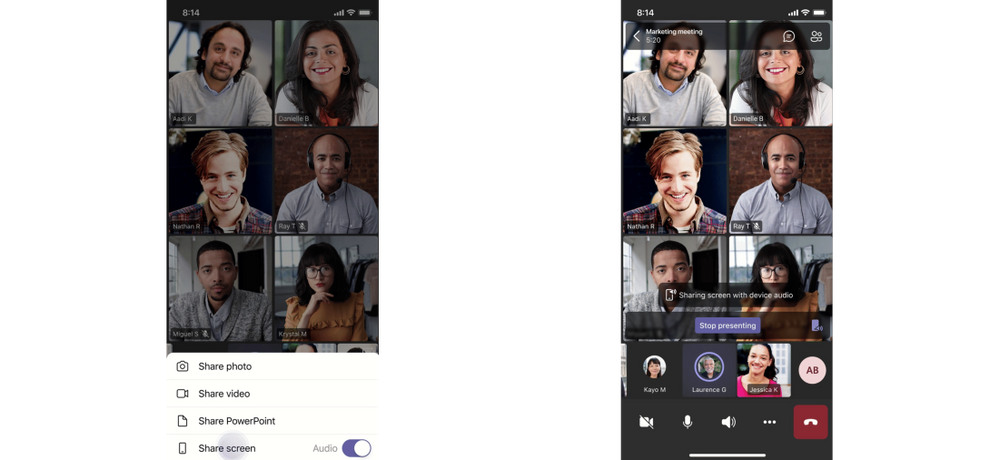 現在,您可以在 Teams 會議期間在 iOS 和 Android 設備上共享時包括音頻。例如,當共享帶有畫外音和音樂的視頻時,您和您的同事可以同時觀看,而不會出現迴聲或同步問題。您可以在“更多操作”、“帶音頻共享屏幕”下找到此設置。它適用於搭載 Android 10+ 或 iOS 13+ 的設備。可用於 GCC、GCC-High 和 DOD。