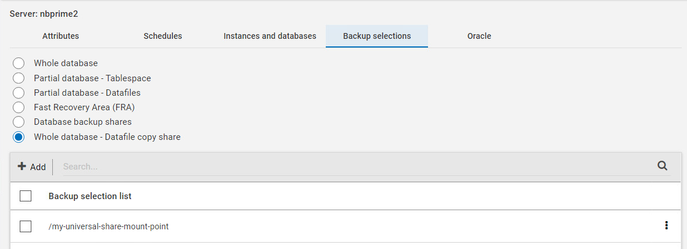 用戶只需設置通用共用,現有的 Copilot 實施和新資料庫就可以輕鬆遷移並使用此新功能。受益於 NetBackup、Flex 和 Flex Scale 中的“增量合併”功能,Universal Shares for Oracle 增強了現有的 Oracle 智慧策略。在所需的位置上創建一個新的通用共用,並將共用掛載為主機上資料庫備份的位置。然後修改現有的智慧策略,使用帶有“整個資料庫--資料檔案複製共用”選項的新掛載點。