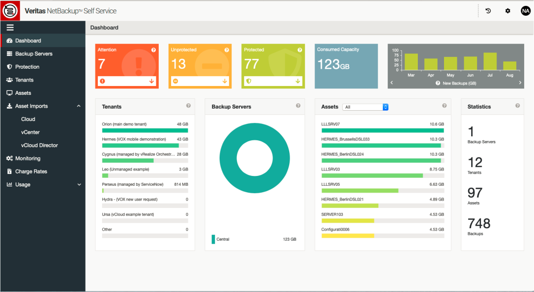 NetBackup 自服務支援多個租戶訪問量身定制的自助服務門戶,通過該門戶,租戶可以直觀地提出備份和恢復基礎架構的請求,並跟蹤和報告其受保護環境的狀態。