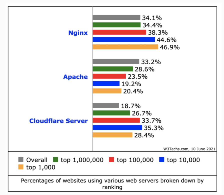 上個月,NGINX 創下了一個重要的里程碑。W3Techs宣佈,NGINX的市場份額現已超越 Apache HTTP Server 成為全球最常用的 Web 伺服器。NGINX 開源軟體一直是、也將始終是我們產品的核心,我們很驕傲也很開心它能夠得到如此之多的開發人員的信賴與青睞。