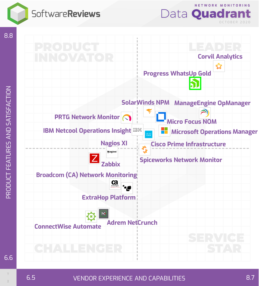 採用真實客戶反饋的客戶評論網站 Software Reviews 指出,WhatsUp Gold 在其一年兩次的資料象限(data quadrant)排名中名列領導廠商之流,而且在針對總共16家廠商的837筆評論中,位居網路監控類軟體的第二名。