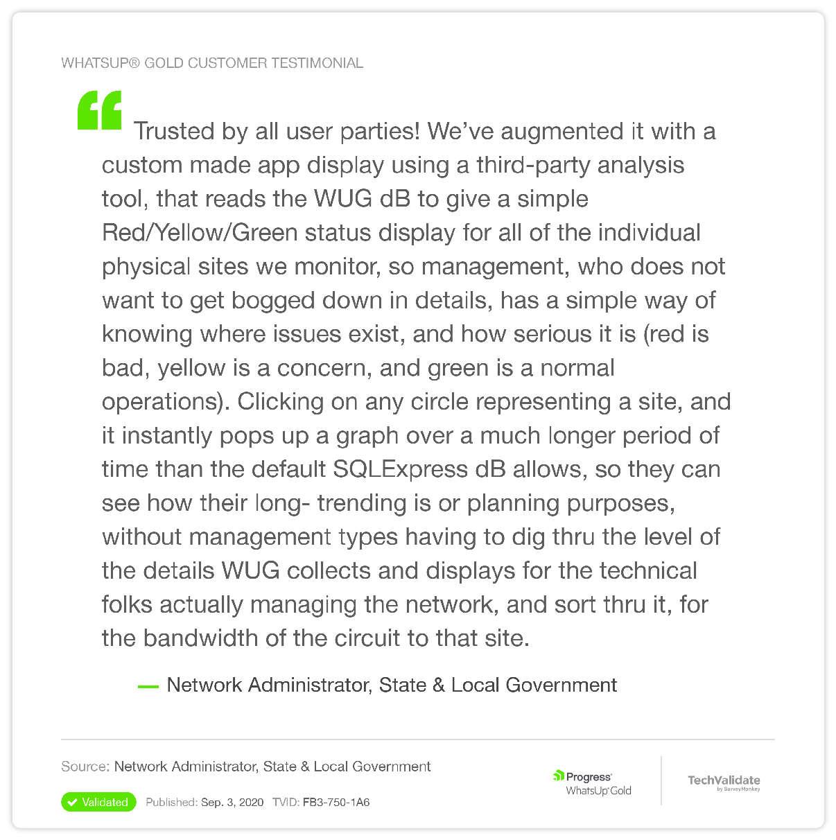 在一項使用 TechValidate 對我們客戶進行的最新調查中,我們發現,WhatsUp Gold 的使用者不僅愛上 WhatsUp Gold,而且89%的受訪企業在頭12個月內就把 WhatsUp Gold 的投資賺回來了!當被問及「您會如何描述 WhatsUp Gold 對您網路/環境的影響」時,一名來自州及地方政府的網路管理員說: