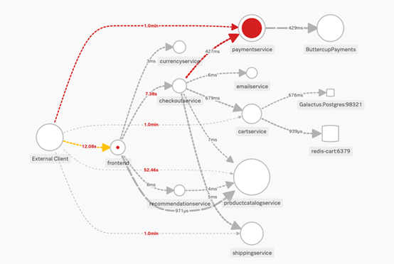 將所有這些資料來源發送到 Splunk 的可觀察性平台,可以讓您很快做到日誌分析無法完成的工作。例如,透過發出的追蹤,您可以看到一個動態服務地圖,顯示出請求的去向和問題發生的地方。與其只看到使用者服務發出 500 的錯誤訊息,然後才透過挖掘日誌來找到出問題的下游相依項,直接在請求圖表上看到實際的下游失敗點不是很好嗎?(見下圖醒目的紅點——這就是錯誤所在)