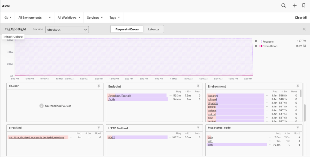 除了在服務地圖上顯示錯誤之外,我們還為資料提供了一個先進的標記系統,可讓您仔細拆解追蹤,以更快找出失敗的原因──您可以按標籤單獨分析,查看是否某些類型的使用者、某個地理位置或某特定版本的應用程式的請求更常失敗。以下是利用標記焦點 (Tag Spotlight) 完成的結果。使用標記焦點功能後,您可以查看按環境、錯誤代碼等細分的問題 (點按圖片放大):