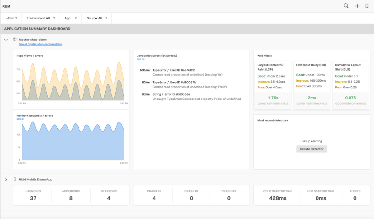 事件分析是可觀察性的最新技術。由於現代應用程式在使用者瀏覽器中執行的次數與在伺服器一樣多 (或更多),因此您必須了解使用者如何與您的應用程式互動。隨著第三方架構、CDN 等數量不斷增加,如果不讓使用者瀏覽器回報正在發生的事情,您根本無法了解整個應用程式和使用者的操作。真實使用者監控 (RUM) 和綜合監控 (Synthetics) 讓您可以即時查看使用者看到的內容,藉此您可以在問題變成使用者發出推文或影響業務之前將其解決。