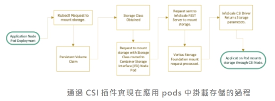 Kubernetes使用InfoScale CSI插件與集群節點上的InfoScale存儲卷接口,允許Kubernetes在其管理的應用程序pods中掛載持久的企業級存儲,然後可以供應用程序使用,輕鬆地擴展至跨多個容器中運行。