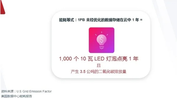 此前,對暗資料的探討更多聚焦於其對企業財務成本的消耗,而環境因素往往被人們忽視。IDC分析預計稱,截止2025年,全球資料存儲量將從2018年的33ZB激增至175ZB,如不改變當下的資料治理策略,暗資料也將于五年間連翻四倍,增至91ZB,而存儲資料所需的能耗也將隨之迎來四倍攀升。美國資料中心能耗報告顯示,1PB未經優化的備份資料在雲中備份一年,所需的用電量可以為1000個10瓦的LED點亮整整一年,同時還會產生高達3.5公噸的二氧化碳廢物,它大約相當於將一輛普通的家用汽車從北極開到南極所產生的排放量。Veritas的資料也發現,2020年大約有640萬噸的二氧化碳因為不必要的資料釋放到大氣中,而640萬噸的二氧化碳相當於一輛汽車繞地球57.5萬圈的排放量,相當於80個國家的年排放量。