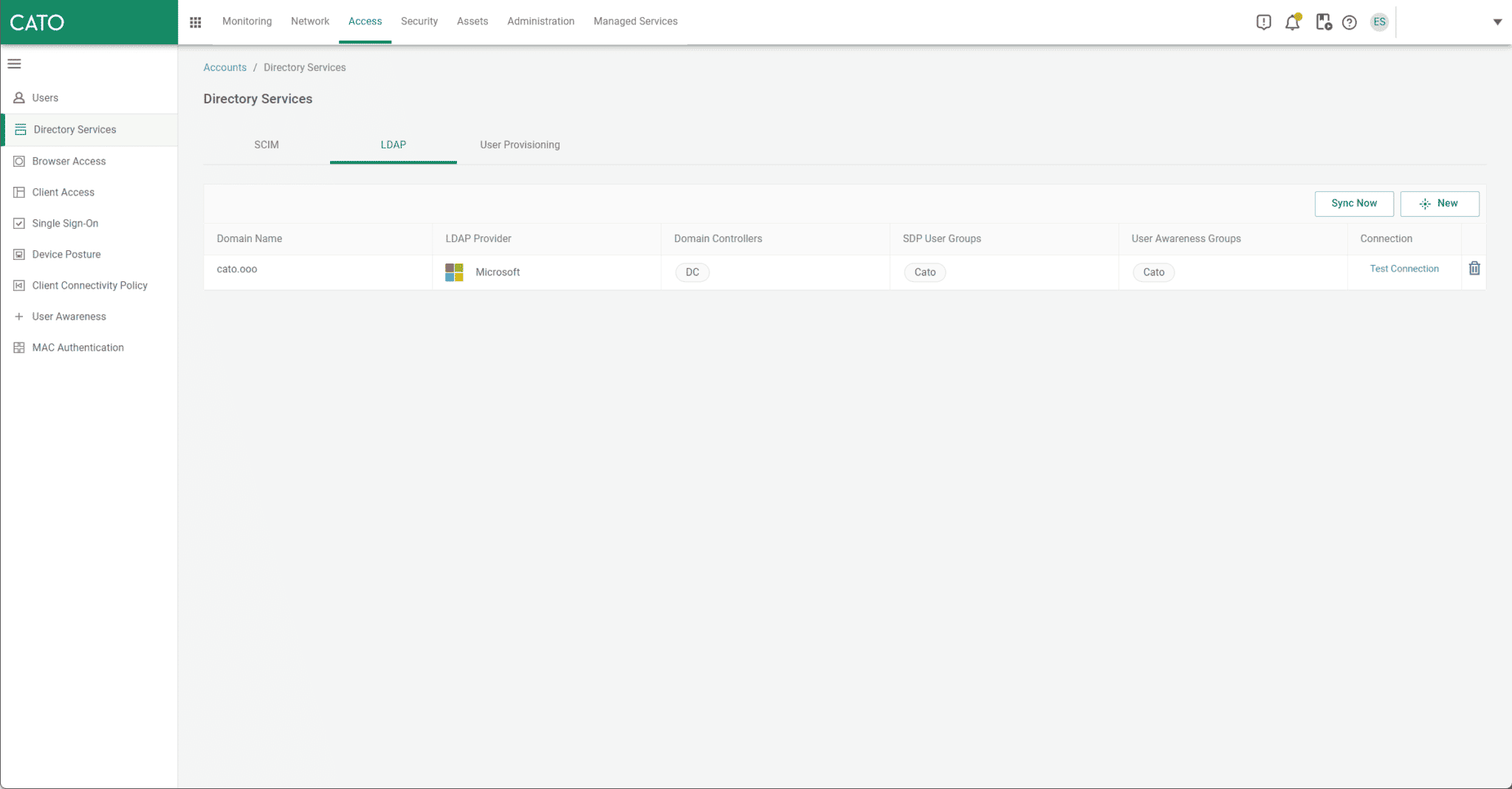 Cato 與 Active Directory 整合作為身分和存取管理的中心。快速設定目錄同步並選擇所需的使用者群組或所有群組,自動啟用這些使用者的遠端存取。應用程式存取控制策略可透過 Cato 管理應用程式配置。